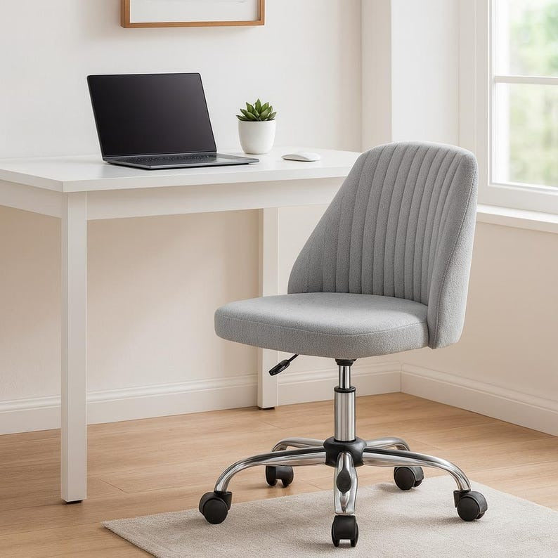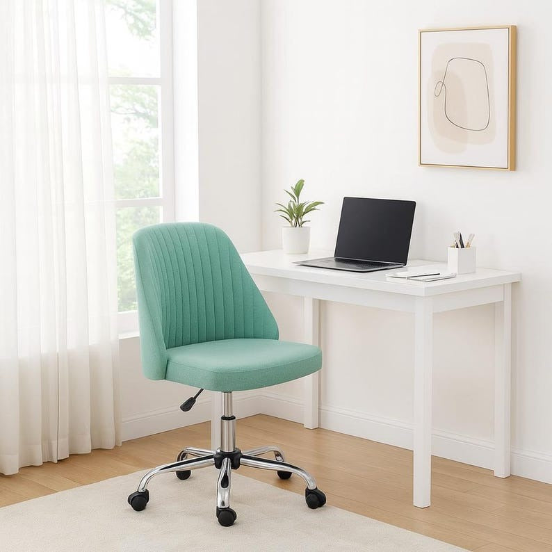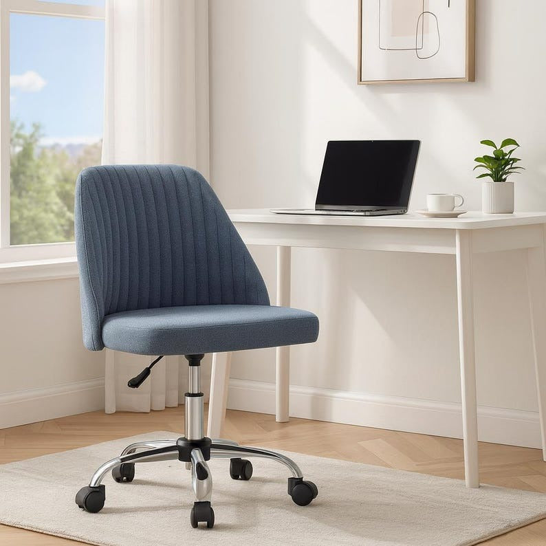 Elevate your workspace with this sleek and comfortable armless swivel office chair. Designed for both style and functionality, it features a supportive fabric-upholstered seat and backrest, smooth 360° swivel, and quiet-rolling wheels for effortless mobility. The adjustable height lift ensures a perfect fit for your desk, while its minimalist armless design allows easy movement and space-saving convenience. Perfect for home offices, study rooms, makeup vanities, or creative studios, this chair offers all-day comfort with a modern touch.