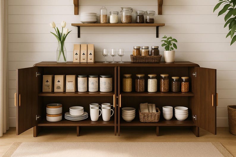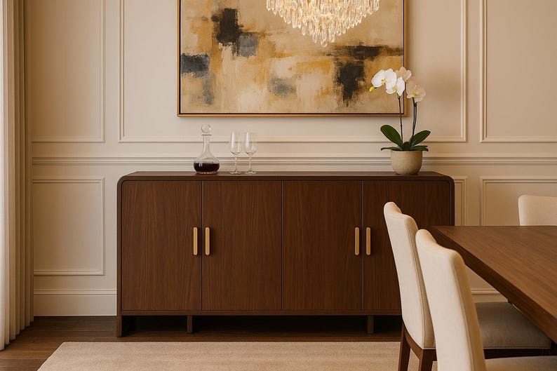 Crafted from high-quality wood with a rich walnut finish, this cabinet features six spacious levels behind flat-panel doors, perfect for storing kitchen appliances, tableware, books, or decorative pieces. Whether in your living room, dining area, or hallway, this piece brings both elegance and practicality to your home.
