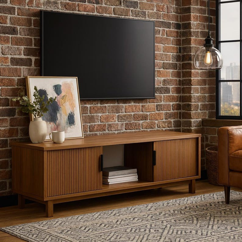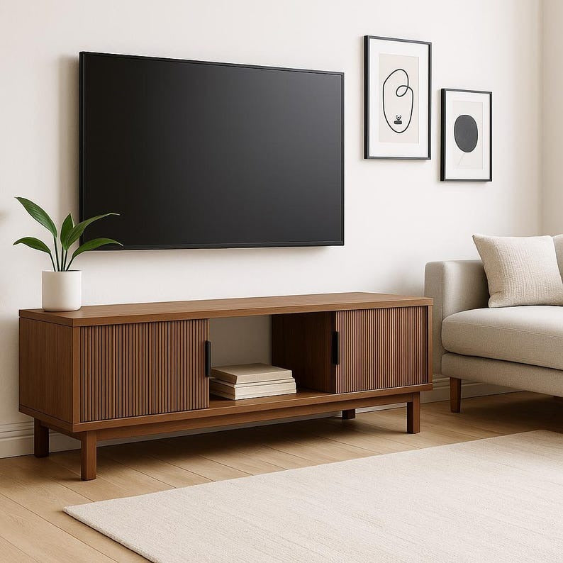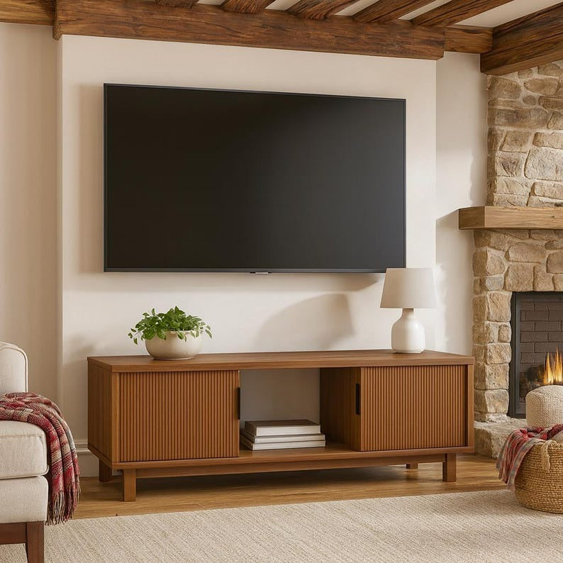 Measuring 58 inches wide, it comfortably accommodates TVs up to 65 inches while offering both style and practicality. The two fluted doors open to reveal hidden shelving, providing organized storage for consoles, media devices, remotes, or décor.