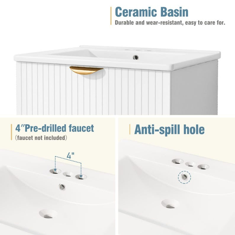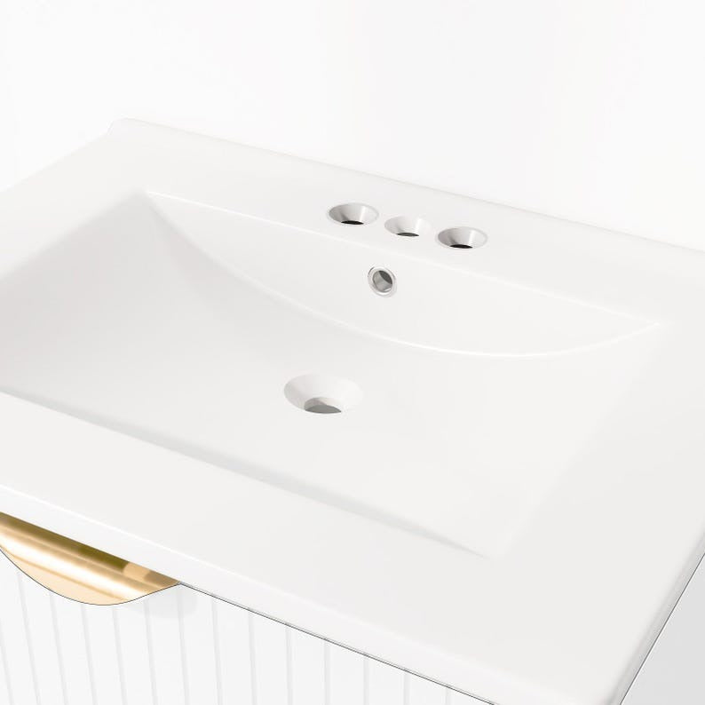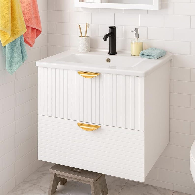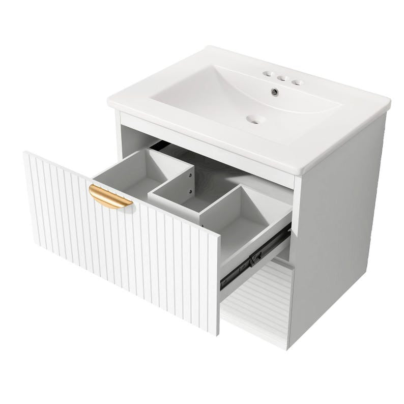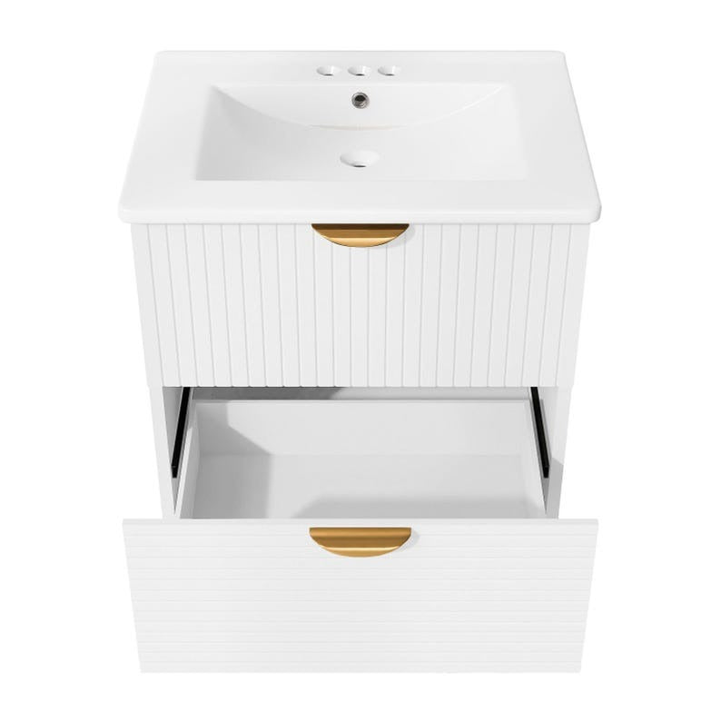 Modern 24-Inch Wall-Mounted Bathroom Vanity with 2 Drawers – White with Gold Handles