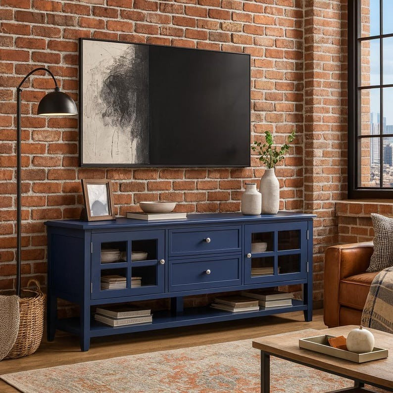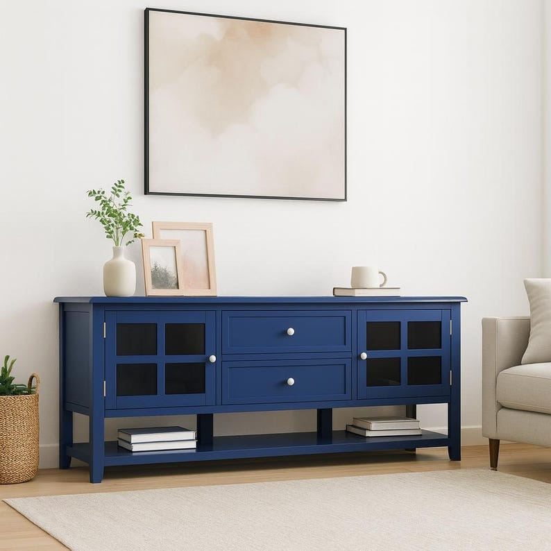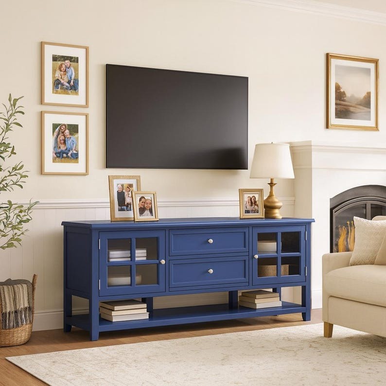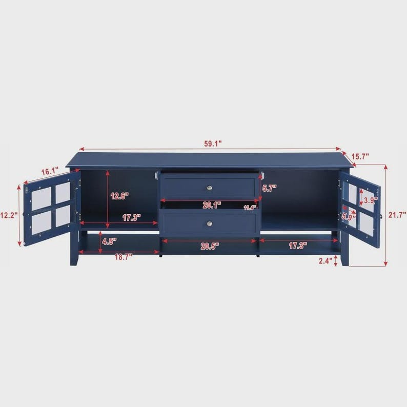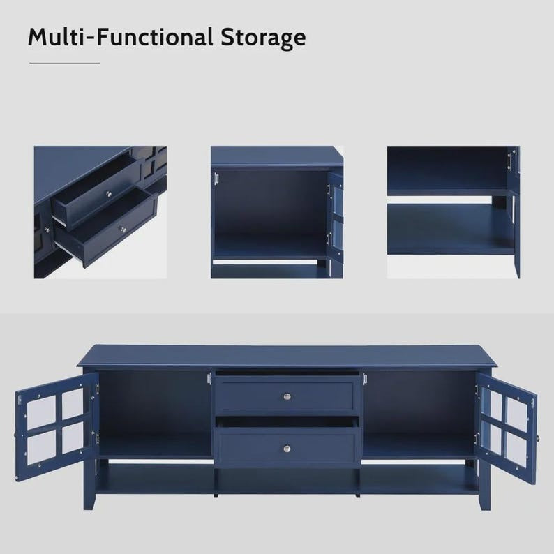 Elevate your living room with this Mid-Century Modern TV Stand, designed with a timeless minimalist aesthetic and durable construction. Perfect for TVs up to 65”, this entertainment console combines function and style with 2 frosted glass doors, 2 smooth drawers, and an open top surface.