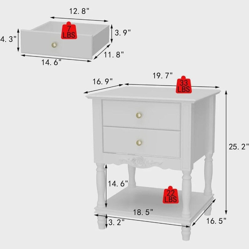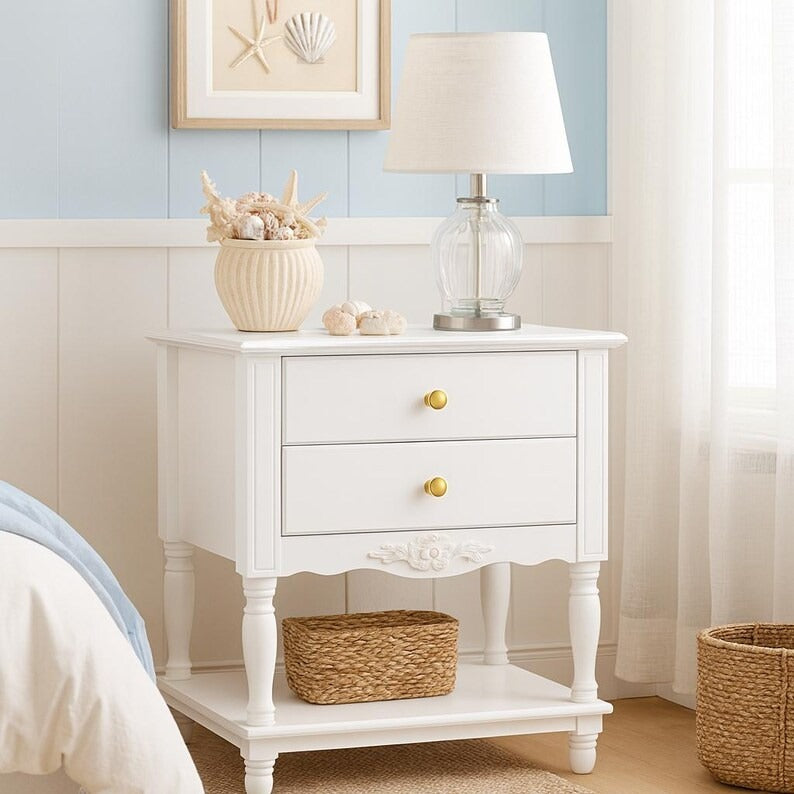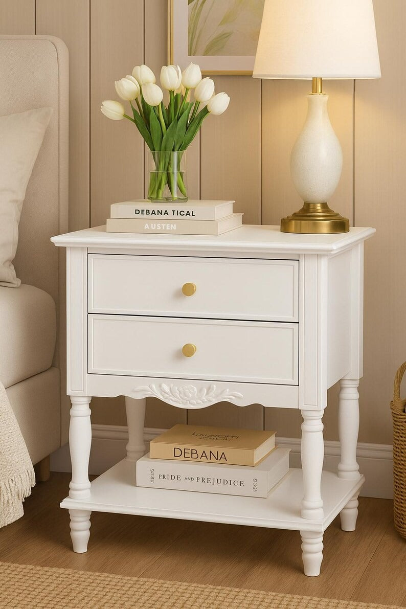 ✨ White Accent Nightstand with Carved Design – 2 Drawers & Bottom Shelf