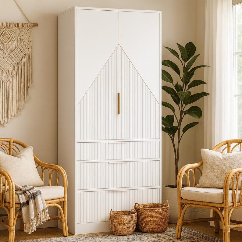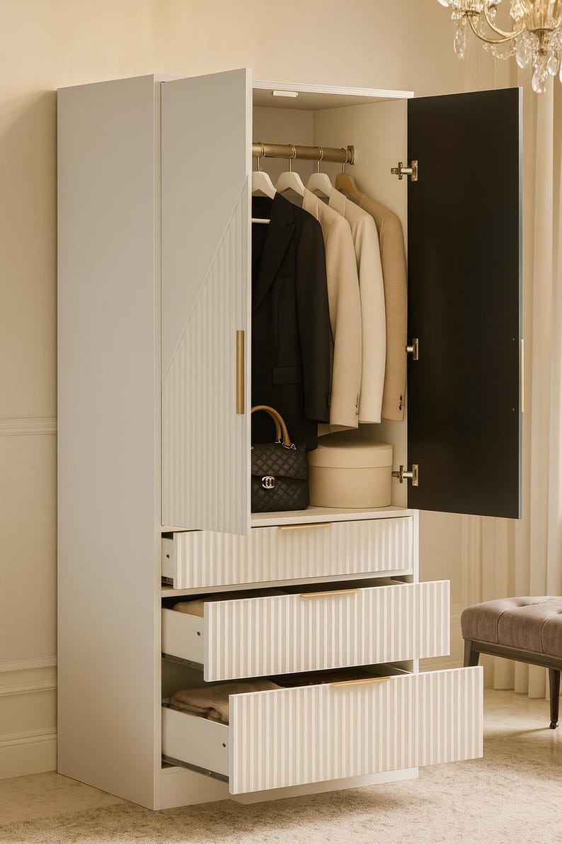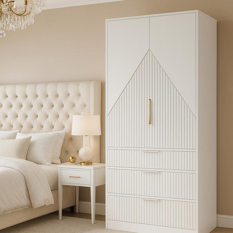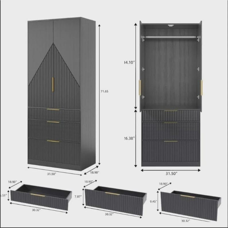 With ample storage space, this wardrobe features a full-length hanging rod—ideal for suits, dresses, coats, and wrinkle-prone clothing—along with three spacious bottom drawers to organize folded clothes, blankets, and everyday essentials.