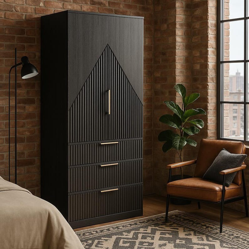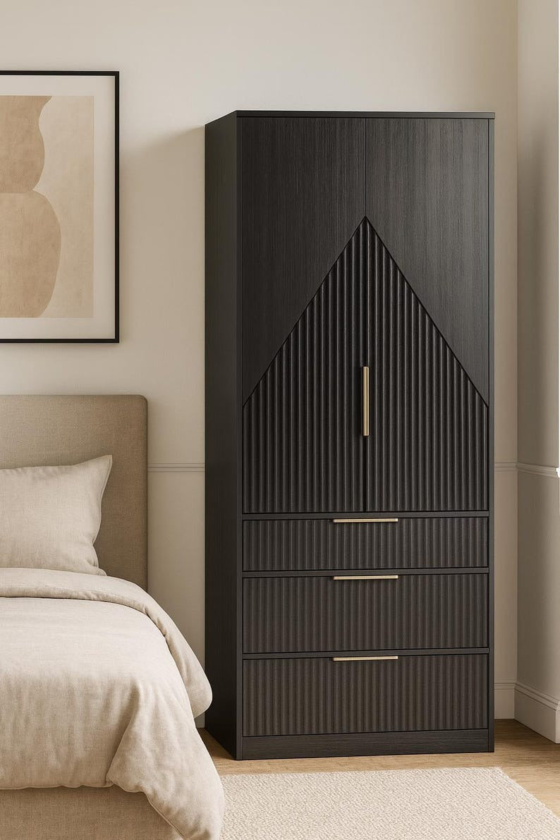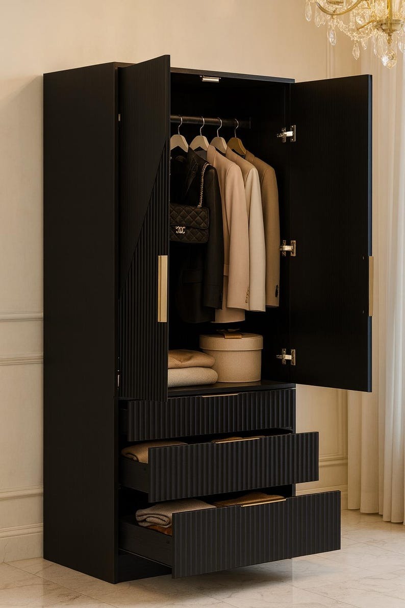 Add style and functionality to your home with this modern wooden wardrobe armoire, designed with a sleek black wood grain finish, gold handles, and elegant wave paneling for a touch of luxury charm. Its clean lines and sophisticated design make it the perfect match for modern, minimalist, or classic interiors.