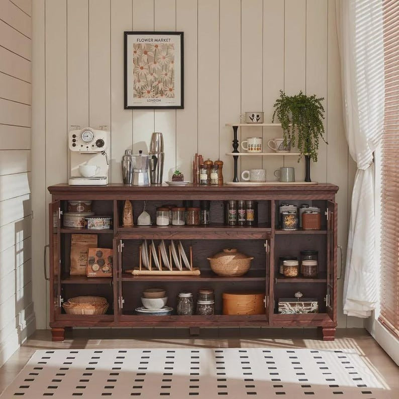 Bring warmth, charm, and storage to your home with this vintage-inspired farmhouse buffet cabinet, designed with a rustic walnut finish and retro details that add character to any space. Perfect for the dining room, kitchen, living room, or home bar, this versatile sideboard doubles as a storage solution and a statement furniture piece.