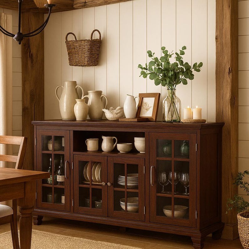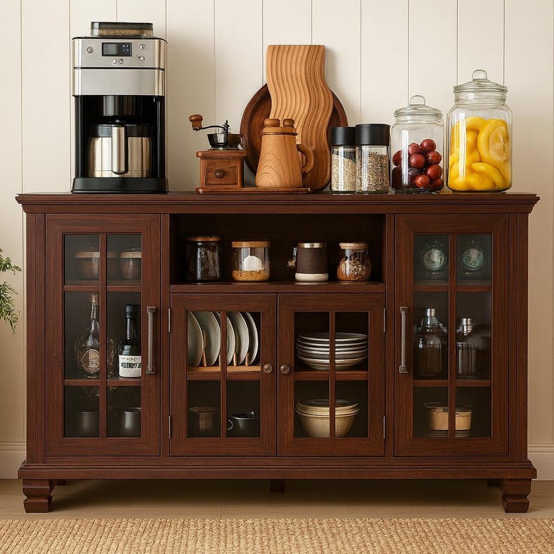 Featuring four framed glass doors—two larger panels on the sides and two smaller doors in the center—this credenza offers a perfect balance of display and hidden storage. Inside, adjustable shelves let you customize the layout to fit everything from tableware and cookware to collectibles and décor. A convenient open shelf above the center doors is ideal for quick-access items or stylish displays.
