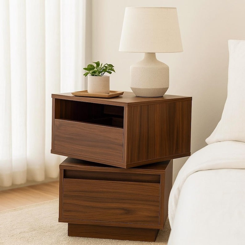 Upgrade your bedroom with this 360° rotatable nightstand, designed with a modern walnut wood finish that blends style with functionality. Its unique rotating top section allows you to easily adjust the angle for convenience, creating a versatile piece that works as a nightstand, end table, or compact dresser.
