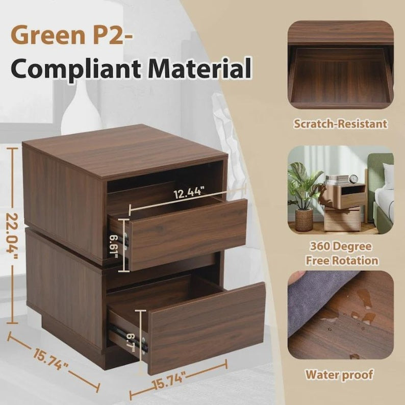Walnut Rotatable Nightstand with 2 Drawers – Modern Bedside & End Table