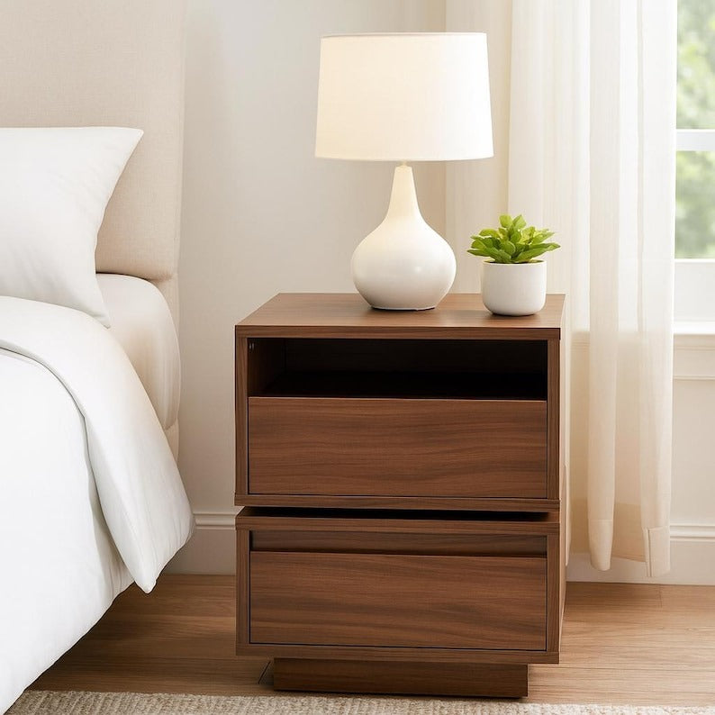 This nightstand features two spacious drawers with smooth metal glides, perfect for organizing books, chargers, remotes, or personal essentials. The open-top surface provides room for a lamp, décor, or morning coffee. Built from scratch-resistant, waterproof engineered wood, it’s both durable and easy to maintain.