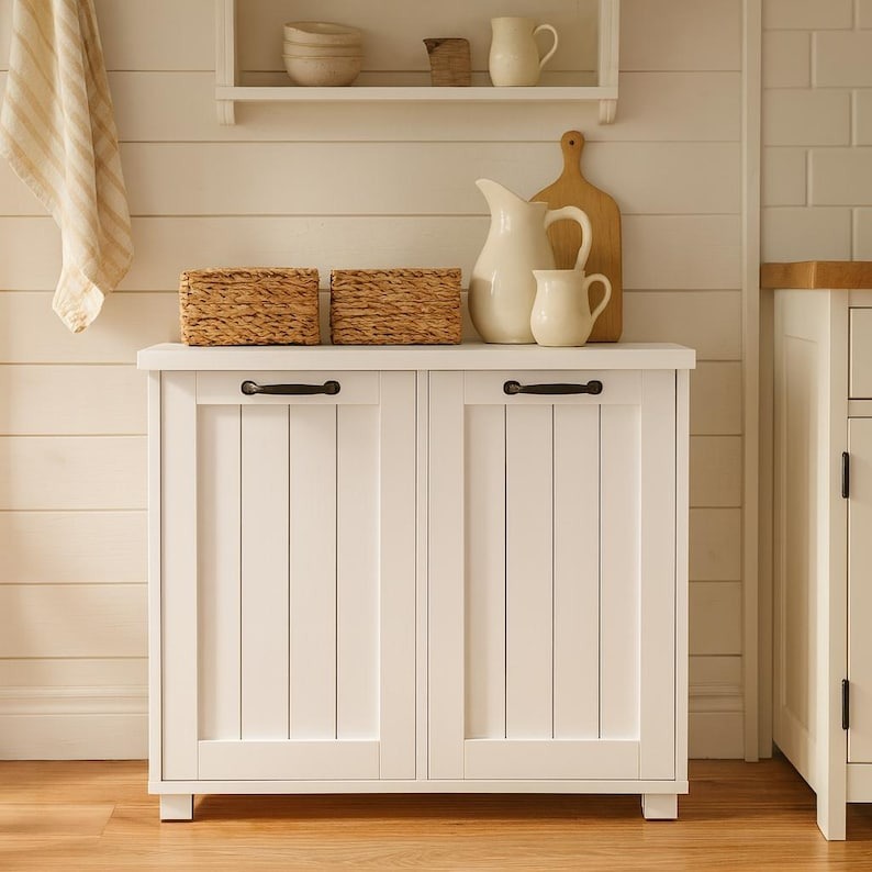 Keep your home organized and stylish with this two-compartment tilt-out cabinet, designed to hide trash, laundry, or recycling while doubling as a functional piece of furniture. With its modern white finish and clean design, this cabinet is perfect for the kitchen, laundry room, bathroom, or entryway.